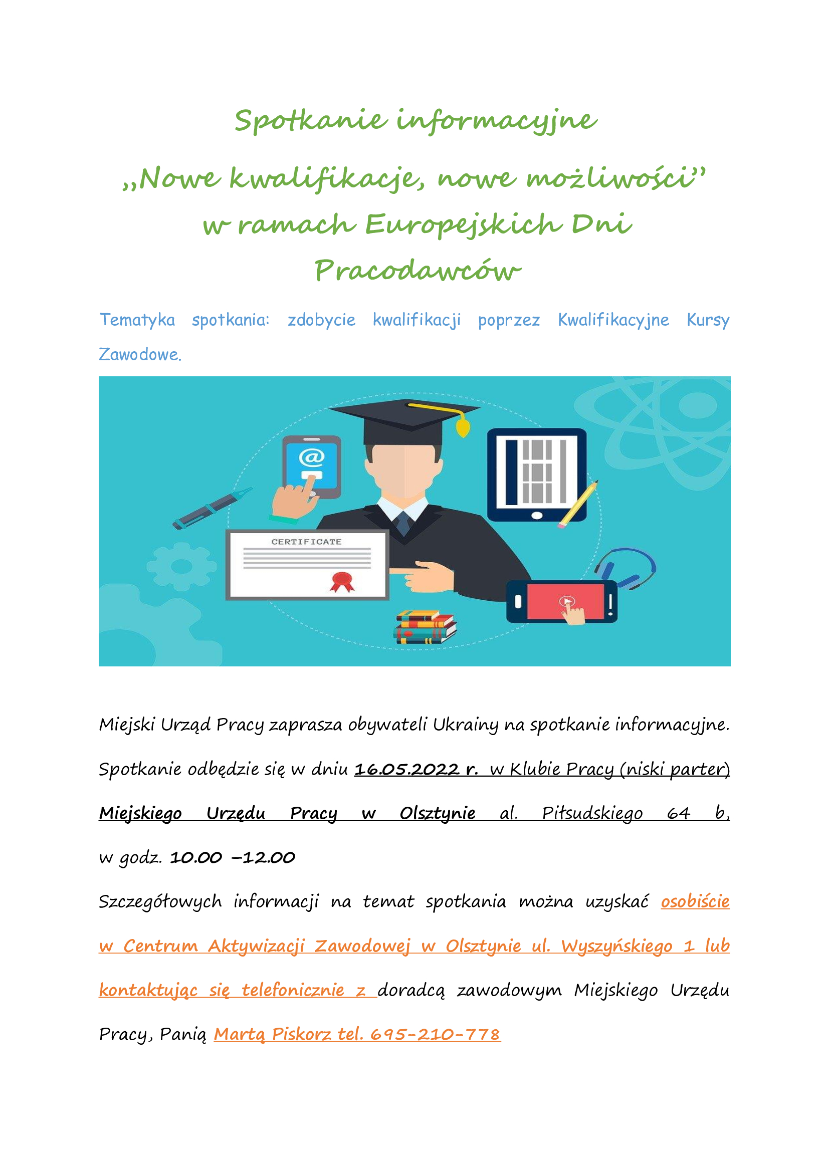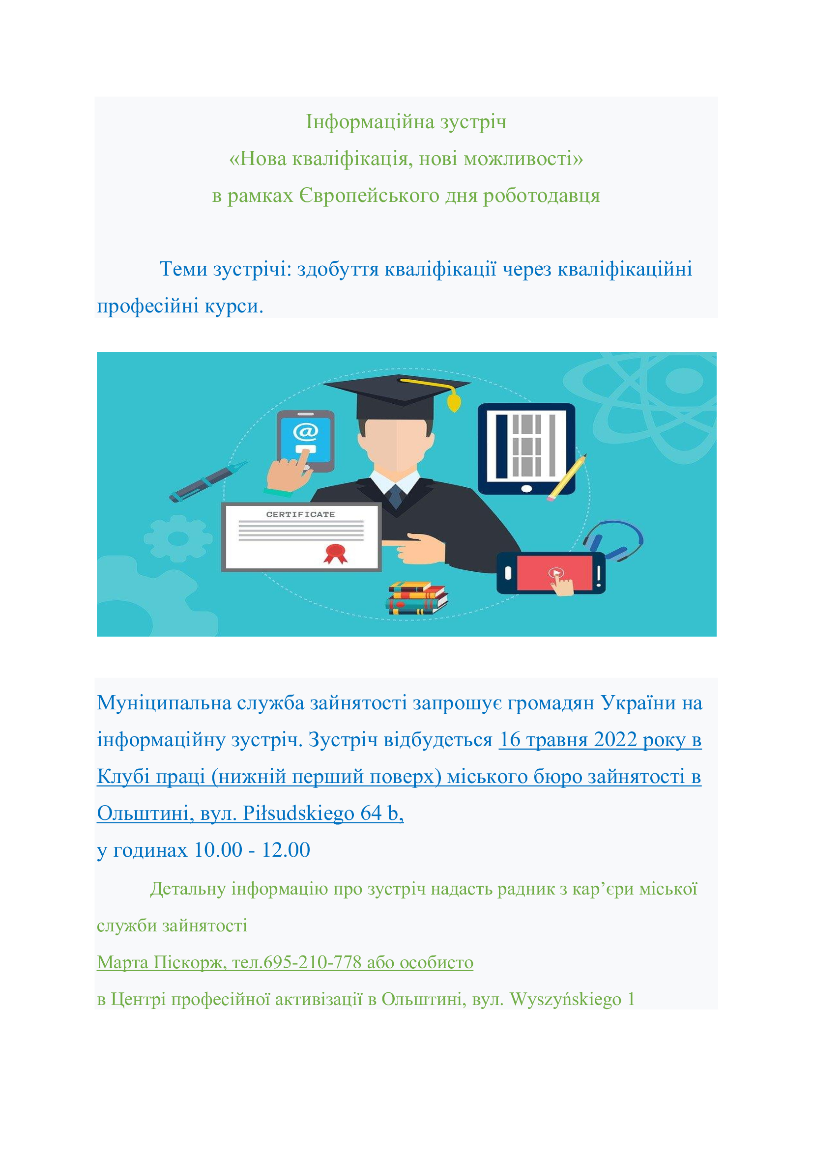 Spotkanie informacyjne „Nowe kwalifikacje, nowe możliwości" w ramach Europejskich Dni Pracodawców. Miejski Urząd Pracy zaprasza obywateli Ukrainy na spotkanie informacyjne. Spotkanie odbędzie się w dniu 16.05.2022 r.  w Klubie Pracy (niski parter) Miejskiego Urzędu Pracy w Olsztynie al. Piłsudskiego 64 b, w godz. 10.00 –12.00.